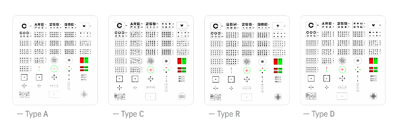 Vengono mantenute charts diversificate (4 tipi di A/C/D/R) per paese, inclusi equilibrio binoculare, aniseikonia, stereopsi, grafico del test della visione binoculare