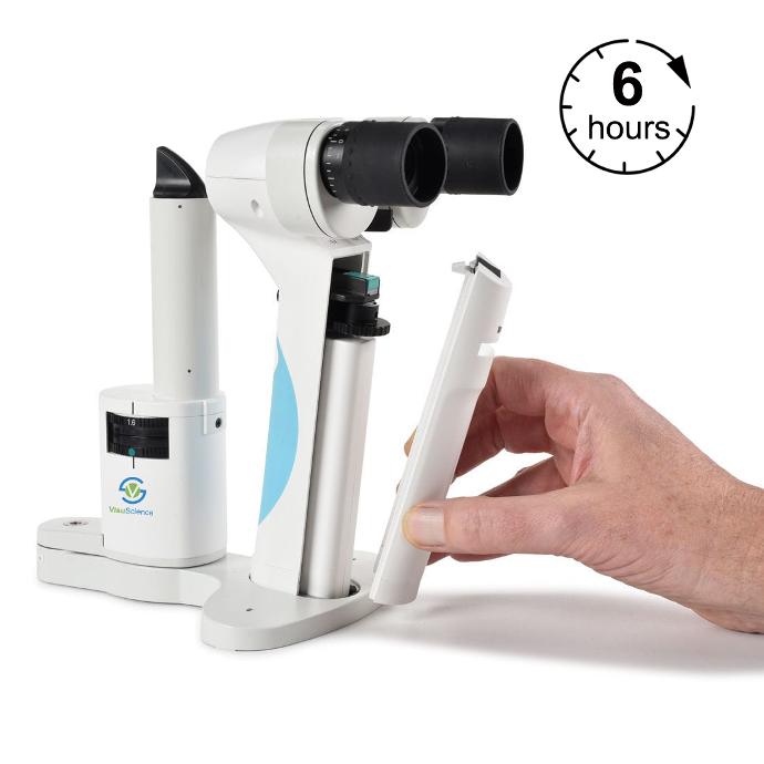 Nella lampada a fessura portatile VisuScience viene applicata una batteria agli ioni di litio ricaricabile personalizzata. Dopo una carica completa, la lampada a fessura può essere utilizzata per 6 ore ininterrottamente.